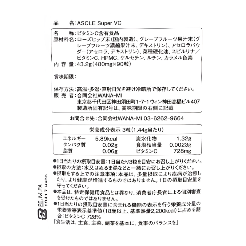 ローズヒップ末(国内製造)、クレープフルーツ果汁末(グレープフルーツ濃縮果汁末、デキストリン)、アセロラパウダー(アセロラ、デキストリン)菜種硬化油、スピルリナ/ビタミンC、HPMC、ケルセチン、ルチン、カラメル色素